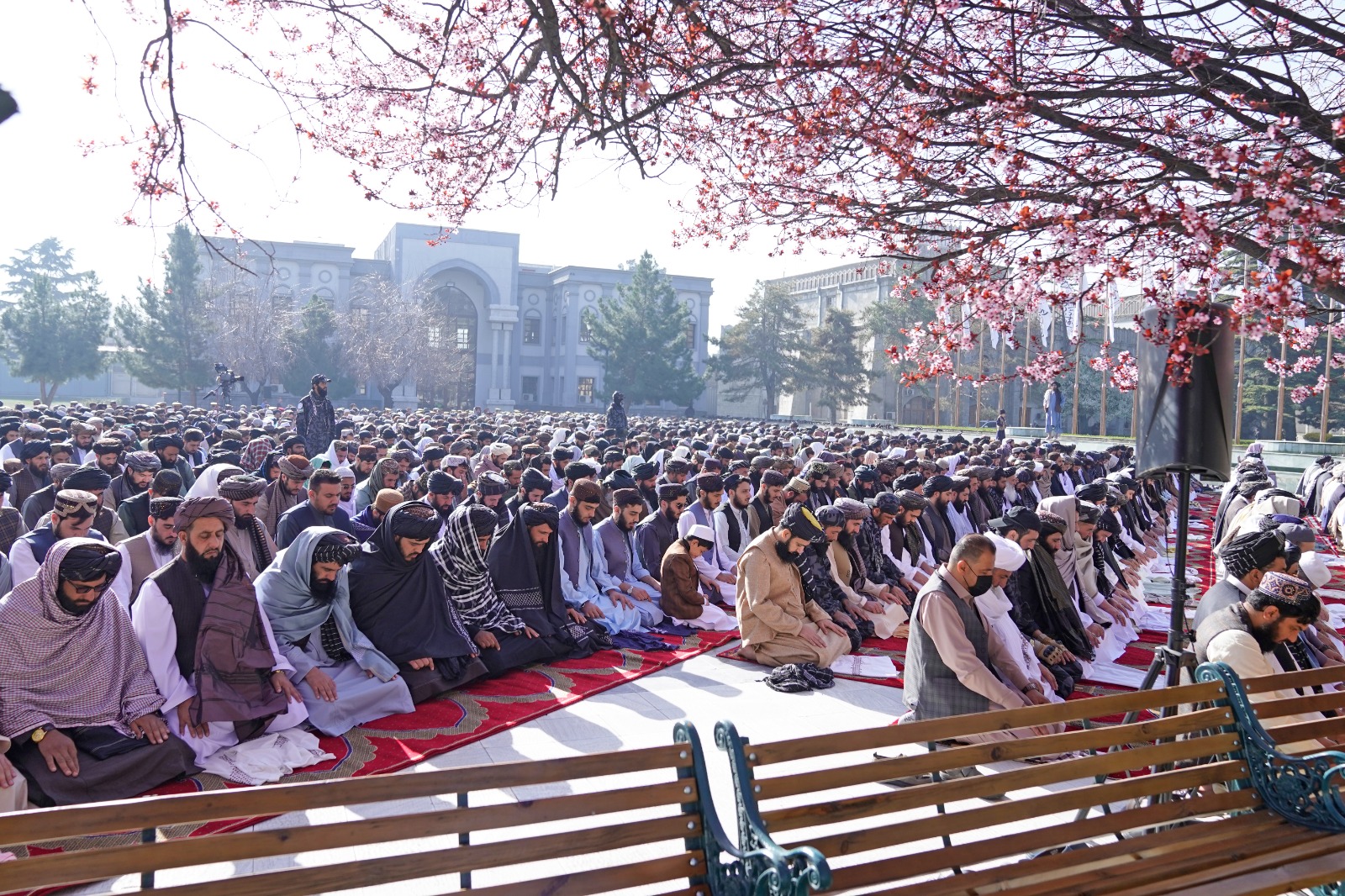 در مراسم نماز عید که برعلاوۀ معاونین اقتصادی و اداری ریاست الوزراء امارت اسلامی افغانستان، رئیس عمومی دفتر مقام عالی ریاست الوزراء، وزرای کابینه، شماری از مقامات ملکی و نظامی امارت اسلامی و تعدادی از اقشار مختلف مردم اشتراک داشتند، آنان پس از ادای نماز با همدیگر مصافحه و عید مبارکی نمودند.