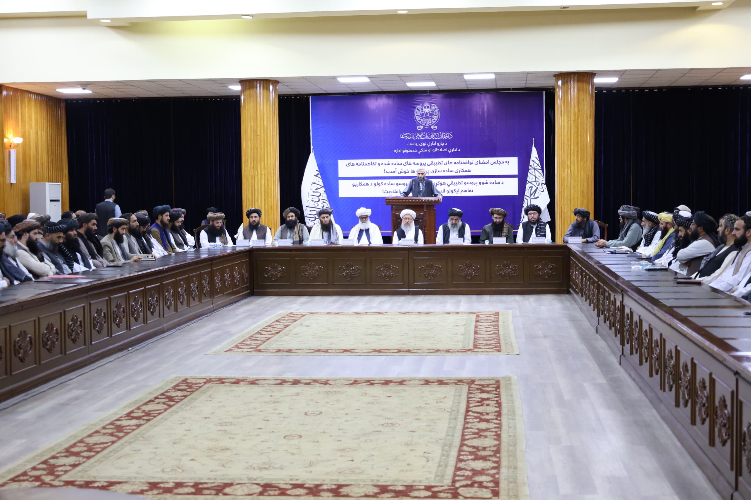 د افغانستان اسلامي امارت د ریاست الوزراء اداري مرستیال محترم مولوي عبدالسلام حنفي نن له غرمې مخکې، د ادارو ساده کولو پروسو د تطبیق هوکړه لیک د لاسلیک په مراسمو کې ګډون او وینا وکړه.