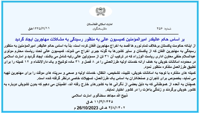از اینکه حکومت پاکستان برخلاف تمام نورم ها قصد به اخراج مهاجرین افغان کرده است، بنأ به اساس حکم عالیقدر امیرالمؤمنین به منظور رسیدگی به مهاجرین افغان که از پاکستان و سایر کشورها به گونه جبری اخراج می شوند، کمیسیون عالی تحت ریاست محترم مولوی عبدالسلام حنفی معاون اداری ریاست الوزراء که در ترکیب آن ۳۱ تن از مسؤولین عالی رتبه شامل می باشند، ایجاد گردید و امارت اسلامی در محدوده امکانات خویش به هدف ارائه خدمات اولیه طرزالعملی را در ۸ فصل و ۳۱ ماده توشیح و یک دارالانشاء و ۱۲ کمیته را برای تطبیق طرزالعمل متذکره منظور نمود.