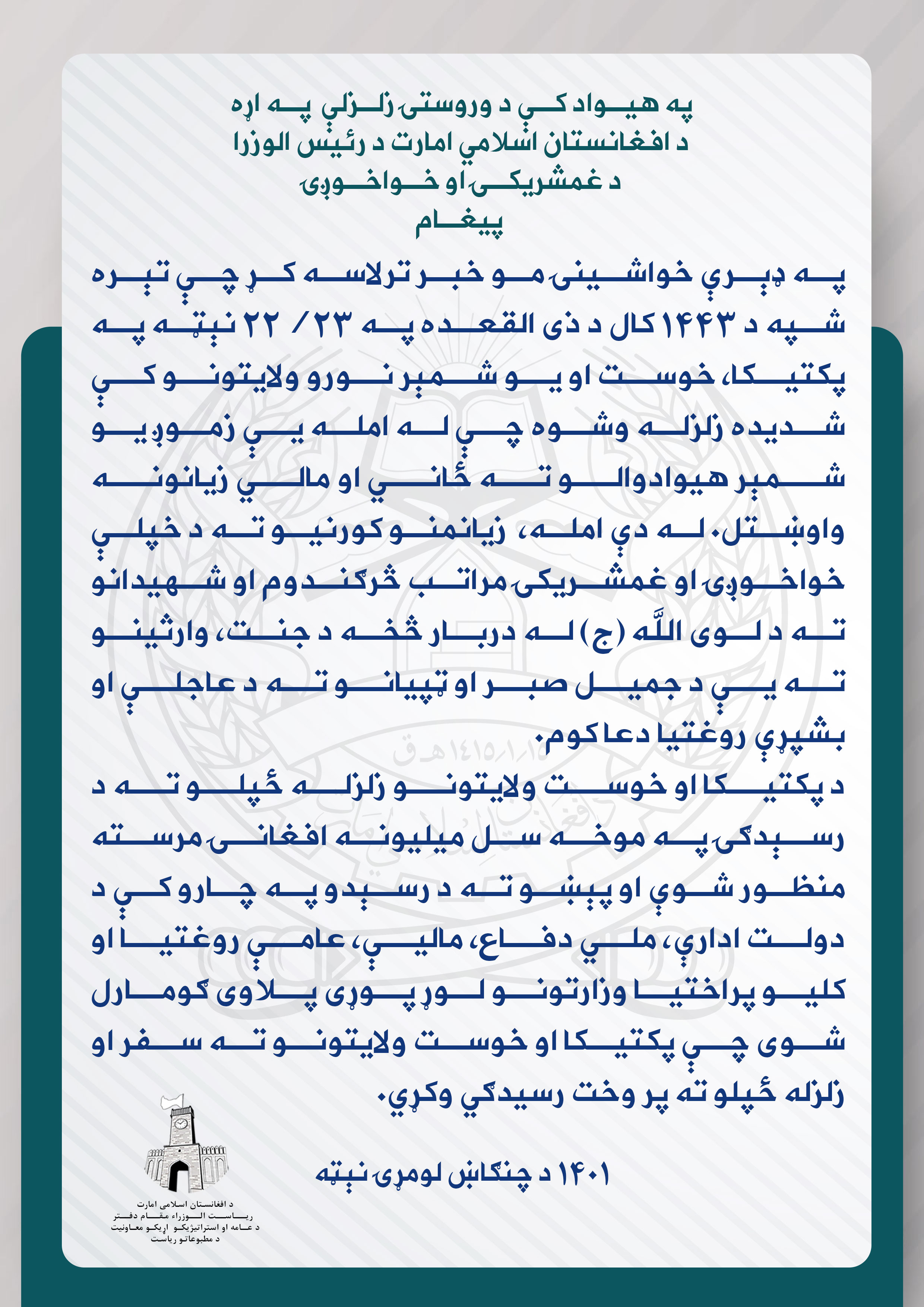 با تألم و تأثر فراوان اطلاع یافتم که شب گذشته مورخ ۲۲/۲۳ ذی القعده ۱۴۴۳ در ولایت های پکتیکا، خوست و برخی ولایات دیگر زلزله‌ای شدید به وقوع پیوست که در اثر آن تلفات جانی و خسارات مالی را به شماری از هموطنان به بار آورد.