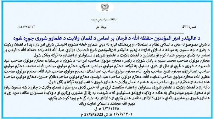 د شرعي نصوصو له مخې د اسلامي نظام د استحکام او پرمختګ لپاره له ديني علماوو څخه مشوره اخيستل شرعي امر دی، بناءً د لغمان ولایت د چارو د ښه سمون په موخه د اسلامي امارت د زعیم عالیقدر امیرالمؤمنین شیخ الحدیث مولوي هبة الله اخندزاده حفظه الله د فرمان پر اساس په لاندي نومونو علماء کرام او متنفذین د لغمان ولایت د علماوو شوری د مسئولینو او اعضاوو په توګه وټاکل شول.